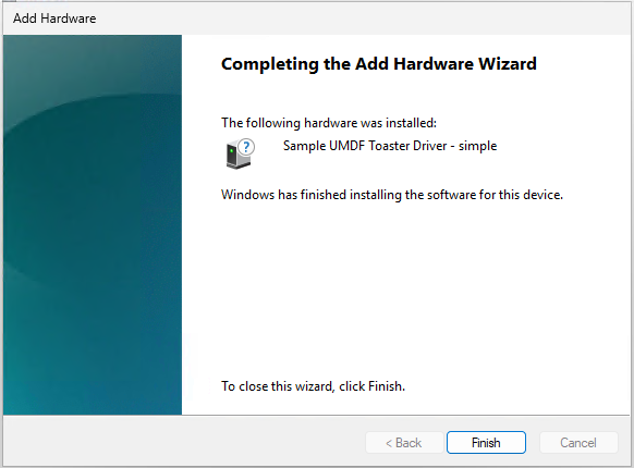 以下は実際に Toaster UMDF ドライバーをインストールした時のログの抜粋です。>>> [Device Install (DiInstallDevice) - ROOT\UNKNOWN\0000] >>> Section start 2025/09/30 17:19:51.937 cmd: "C:\WINDOWS\system32\mmc.exe" C:\WINDOWS\system32\devmgmt.msc ndv: Flags: 0x00000002 dvi: Class GUID of device changed to: {b85b7c50-6a01-11d2-b841-00c04fad5171}. sto: {Setup Import Driver Package: c:\temp\debug\package\wdfsimpleum.inf} 17:19:51.939 inf: Provider: TODO-Set-Provider inf: Class GUID: {B85B7C50-6A01-11d2-B841-00C04FAD5171} inf: Driver Version: 09/30/2025,16.8.45.553 inf: Catalog File: wudf.cat sto: {Copy Driver Package: c:\temp\debug\package\wdfsimpleum.inf} 17:19:51.943 sto: Driver Package = c:\temp\debug\package\wdfsimpleum.inf sto: Flags = 0x00000007 sto: Destination = C:\Users\LOCALA~1\AppData\Local\Temp\{80ada83c-a1a3-e241-a557-f69a205c8309} sto: Copying driver package files to 'C:\Users\LOCALA~1\AppData\Local\Temp\{80ada83c-a1a3-e241-a557-f69a205c8309}'. flq: {FILE_QUEUE_COMMIT} 17:19:51.945 flq: Copying 'c:\temp\debug\package\wdfsimpleum.dll' to 'C:\Users\LOCALA~1\AppData\Local\Temp\{80ada83c-a1a3-e241-a557-f69a205c8309}\wdfsimpleum.dll'. flq: Copying 'c:\temp\debug\package\wdfsimpleum.inf' to 'C:\Users\LOCALA~1\AppData\Local\Temp\{80ada83c-a1a3-e241-a557-f69a205c8309}\wdfsimpleum.inf'. flq: Copying 'c:\temp\debug\package\wudf.cat' to 'C:\Users\LOCALA~1\AppData\Local\Temp\{80ada83c-a1a3-e241-a557-f69a205c8309}\wudf.cat'. flq: {FILE_QUEUE_COMMIT - exit(0x00000000)} 17:19:51.953 sto: {Copy Driver Package: exit(0x00000000)} 17:19:51.953 ump: Import flags: 0x00000000 pol: {Driver package policy check} 17:19:52.002 pol: {Driver package policy check - exit(0x00000000)} 17:19:52.002 sto: {Stage Driver Package: C:\Users\LOCALA~1\AppData\Local\Temp\{80ada83c-a1a3-e241-a557-f69a205c8309}\wdfsimpleum.inf} 17:19:52.002 inf: Provider = TODO-Set-Provider inf: Class GUID = {b85b7c50-6a01-11d2-b841-00c04fad5171} inf: Driver Version = 09/30/2025,16.8.45.553 inf: Catalog File = wudf.cat inf: Version Flags = 0x00000013 (以下、省略)