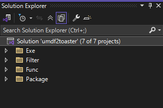 - [Solution Explorer] を見ると、そのソリューション内には Exe, Filter, Func, Package というプロジェクトがありますが、ひとまず Solution 部分をクリックします。