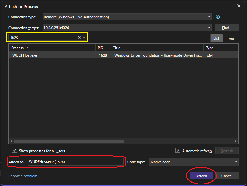 次の手順を実施して、開発環境の PC から ターゲット PC 上のプロセスに対して、デバッガーをアタッチして、デバッグ可能な状態にします。