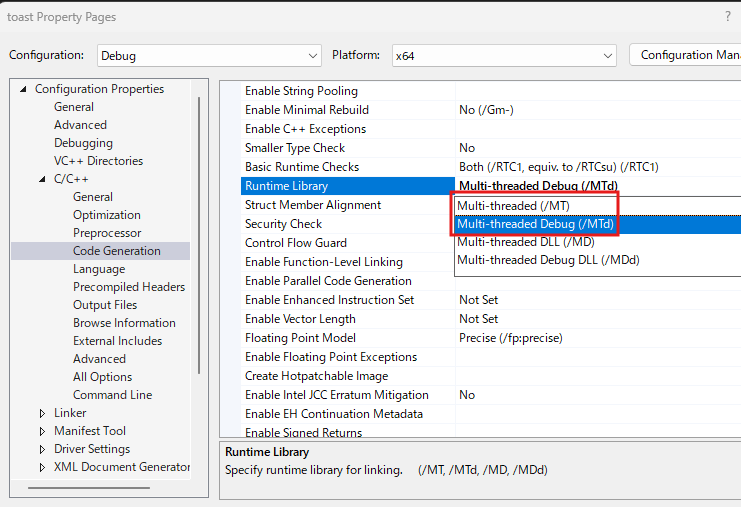 toast.exe の実行時 VCRUNTRIME140.dll が見つからないといったエラーが出る場合は、プロジェクトのプロパティでランタイム ライブラリの設定を/MT