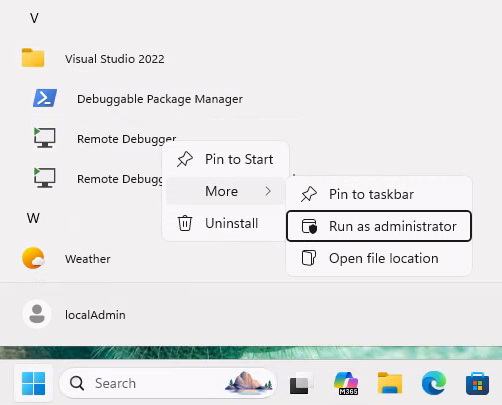 ターゲット PC 上にインストールした Remote Tools for Visual Studio の Remote Debugger を [管理者として実行] で起動します。初回起動の場合、ファイアウォールの設定が表示されますが、すべて既定の状態で起動します。