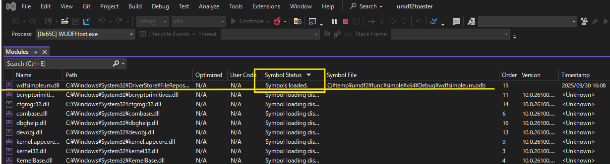 Visual Studio のメニューから [デバッグ] > [ウィンドウ] > [モジュール] の順にクリックして、UMDF ドライバーのシンボルがロードされていることを確認します。