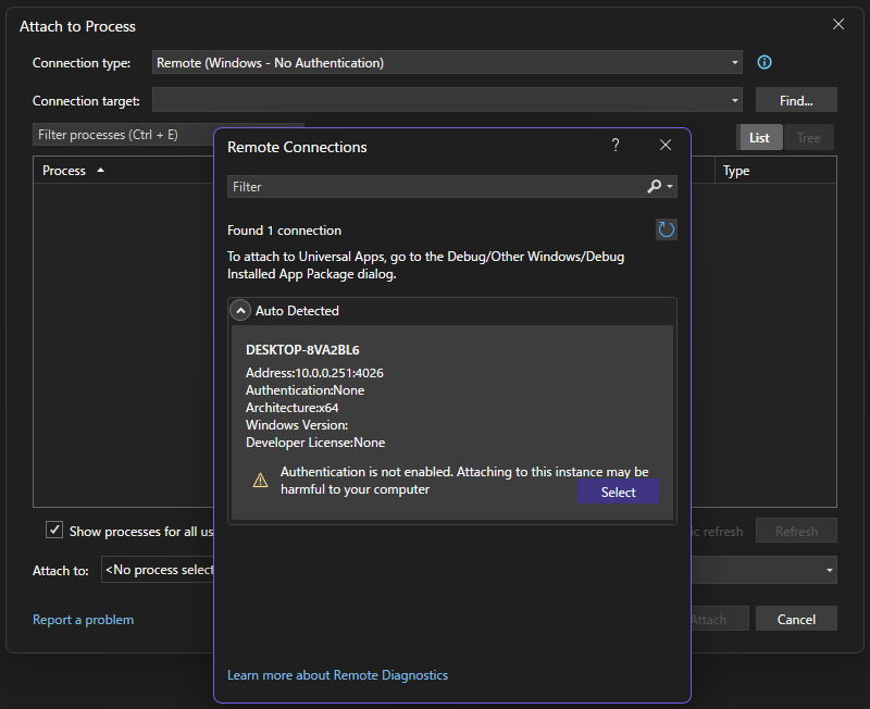 開発環境の PC の Visual Studio で [デバッグ] > [プロセスにアタッチ] を選択し (または Ctrl+Alt+P キーを押し)、**[プロセスにアタッチ]** ダイアログ ボックスを開きます。