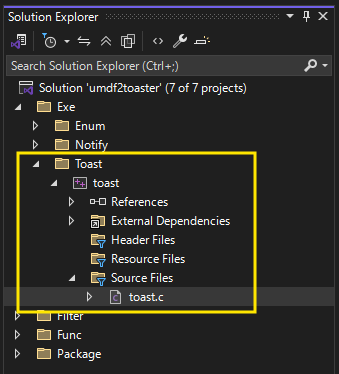 関連ドキュメント: /MD、/MT、/LD (ランタイム ライブラリを使用)開発環境の Visual Studio で Func\Simple\Source Files\toast.c を開き、